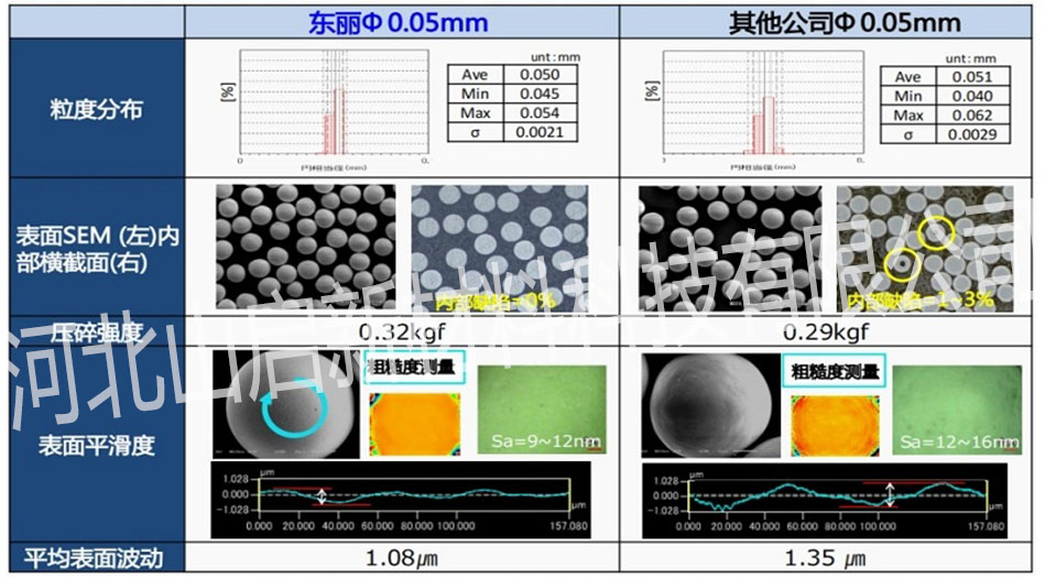 lφ0.1毫米以下的珠子在粒度分布和表面平滑度方面質(zhì)量較高,平滑度是其他品牌的1.2-1.8倍,能有效提高粉碎效果