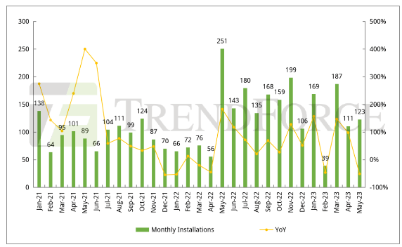 3. 2023年1-5月土耳其光伏新增裝機量達629 MW,同比增長20.8%,其中,5月土耳其光伏新增裝機123MW,同比下降51%,環比增長11%。2023年2月,土耳其設定太陽能電池進口最低價格,利好土耳其本地制造商;2023年5月,土耳其政府針對太陽能光伏和其他類型的可再生能源推出10年FIT,刺激光伏裝機需求增長。